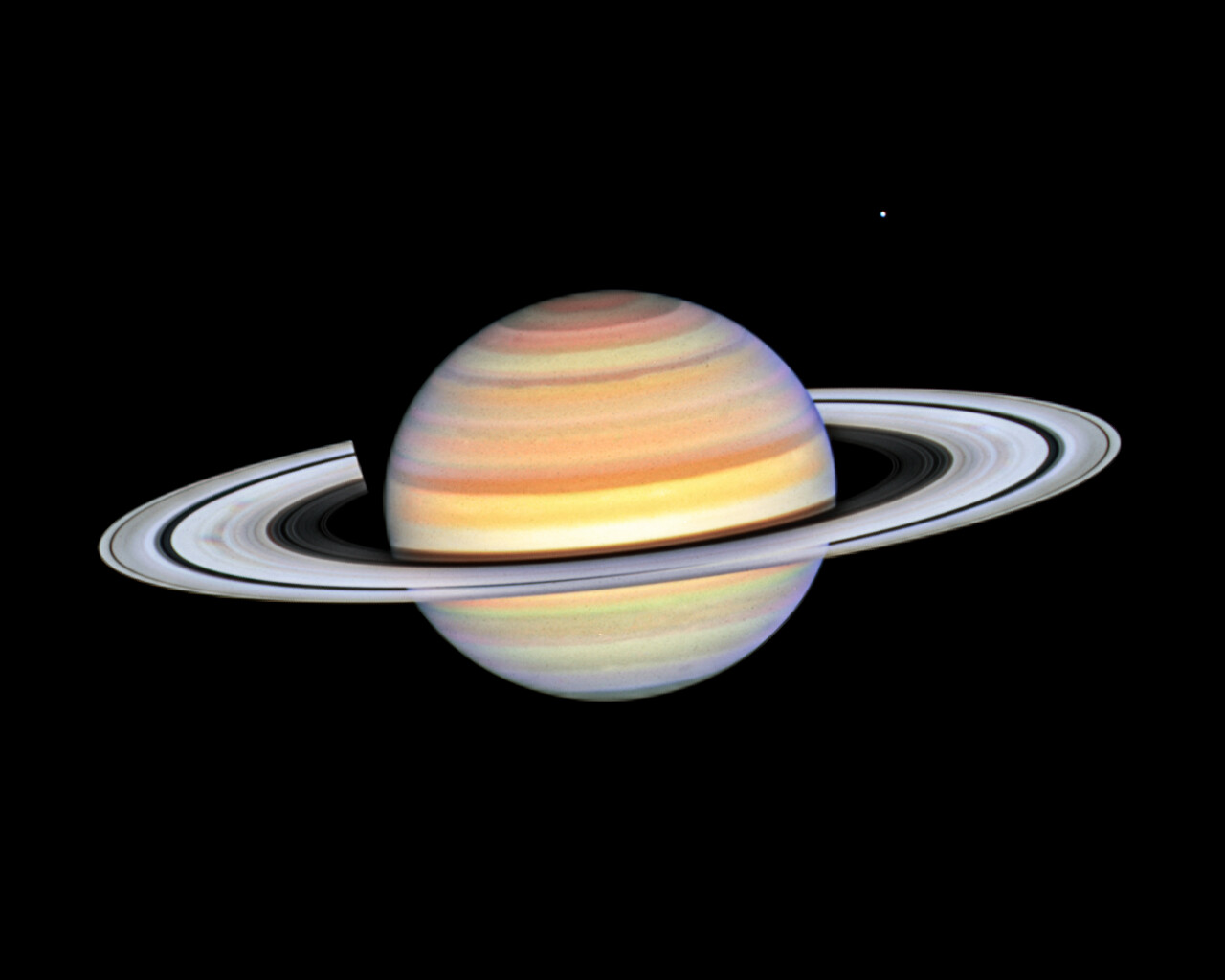 This Hubble Space Telescope photo of Saturn was taken on October 22, 2023, when the ringed planet was approximately 850 million miles from Earth. Hubble imaging is so sharp it resolves a phenomenon called ring spokes appearing on both sides of the planet simultaneously as they spin around the giant world. In 1981, NASA’s Voyager 2 first photographed the ring spokes. NASA’s Cassini orbiter also saw the spokes during its 13-year-long mission that ended in 2017. Hubble continues observing Saturn annually as the spokes come and go. This cadence has been captured by Hubble’s Outer Planets Atmospheres Legacy (OPAL) program that began nearly a decade ago to annually monitor weather changes on all four gas giant outer planets. Hubble’s crisp images show that the frequency of spoke apparitions is seasonally driven, first appearing in OPAL data in 2021 but only on the morning (left) side of the rings. Long-term monitoring show that both the number and contrast of the spokes vary with Saturn’s seasons. Saturn is tilted on its axis like Earth, and has seasons lasting approximately seven years. “We are heading towards maximum spoke season, so we’d expect to see more of what we’re seeing now, with higher frequency and darker spokes appearing over the next few years,” said the OPAL program lead scientist, Amy Simon of NASA’s Goddard Space Flight Center in Greenbelt, Maryland. The spokes are transient features that rotate along the ring plane. Their ghostly appearance only persists for two or three rotations around Saturn. During active periods, freshly-formed spokes continuously add to the pattern. These ephemeral structures can stretch longer than Earth’s diameter! “The leading theory is that spokes are tied to Saturn’s powerful magnetic field, with some sort of solar interaction with the magnetic field that gives you the spokes,” said Simon. When it’s summer or winter on Saturn, the planet and its rings are tilted more toward the Sun. In this configuration, the solar wind may more strongly buffet Saturn’s immense magnetic field, enhancing spoke formation. Planetary scientists think that electrostatic forces generated from this interaction levitate dust or ice above the ring to form the spokes, though after several decades no theory perfectly predicts the spokes. Continued Hubble observations may eventually help solve the mystery. The Hubble Space Telescope is a project of international cooperation between NASA and ESA. NASA’s Goddard Space Flight Center in Greenbelt, Maryland, manages the telescope. The Space Telescope Science Institute (STScI) in Baltimore, Maryland, conducts Hubble and Webb science operations. STScI is operated for NASA by the Association of Universities for Research in Astronomy, in Washington, D.C.