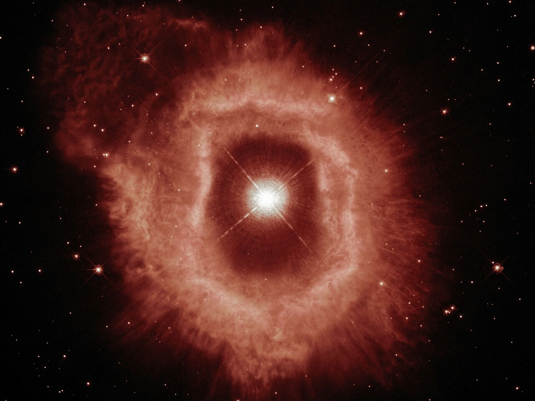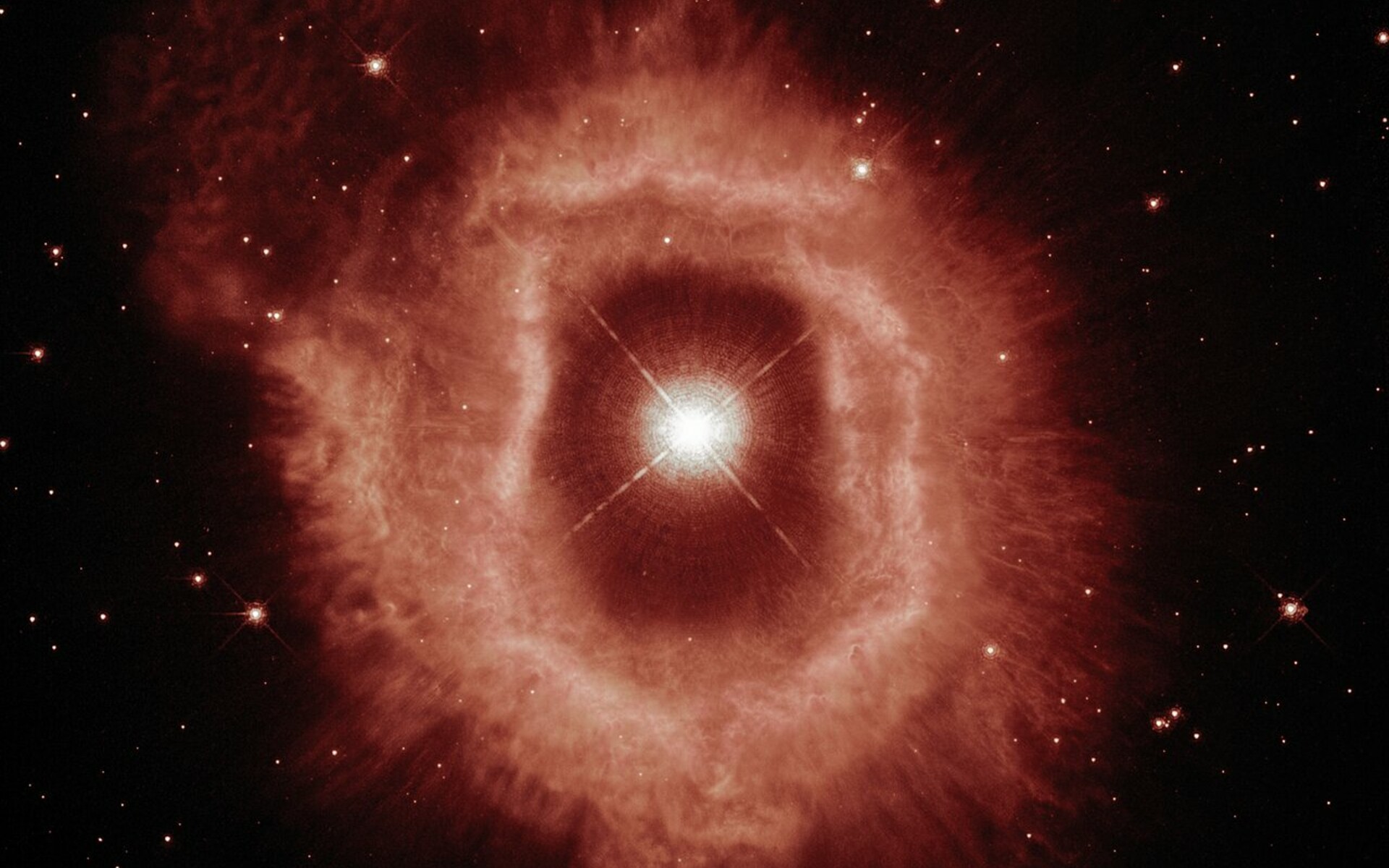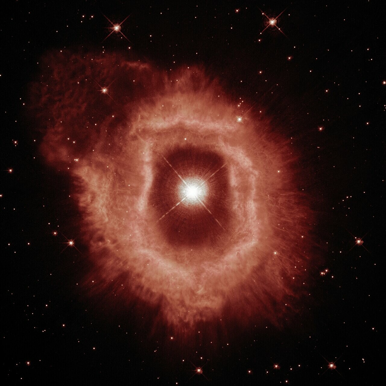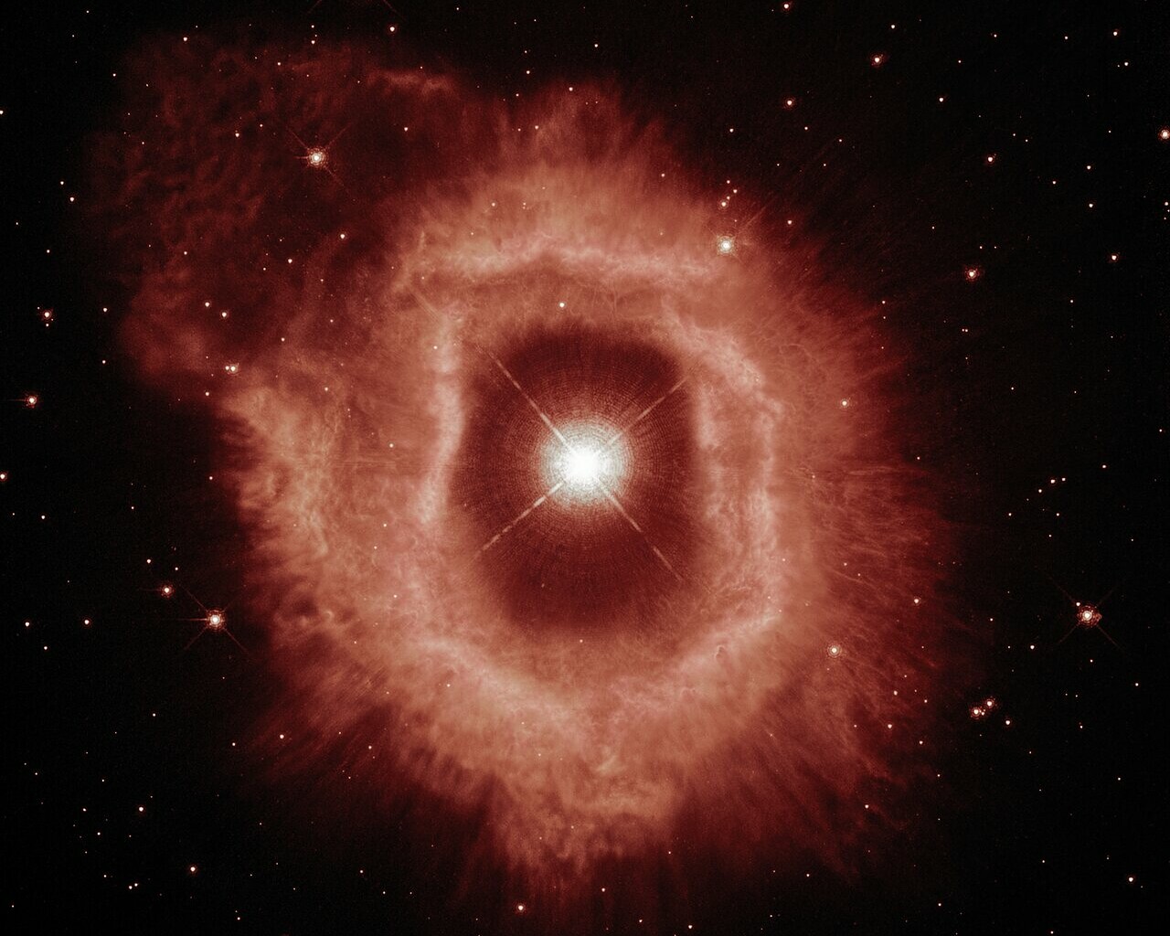 This comparison view shows puffing dust bubbles and an erupting gas shell — the final acts of a monster star.You can explore the detail of the nebula surrounding the star AG Carinae by using the slider tool on the image above. This Picture of the Week showcases new views of the dual nature of the star AG Carinae, which was the target of the NASA/ESA Hubble Space Telescope’s 31st anniversary image in April 2020. This new perspective was developed thanks to Hubble’s observations of the star in 2020 and 2014, along with others captured by the telescope’s WFPC2 instrument in 1994. You can compare these two new versions of AG Carinae by using the slider tool on the image above. The first image showcases the details of the ionised hydrogen and ionised nitrogen emissions from the nebula (seen here in red). In the second image, the blue demonstrates the contrasting appearance of the distribution of the dust that shines of reflected stellar light. Astronomers believe that the dust bubbles and filaments formed within and were shaped by powerful stellar wind . This giant star is waging a tug-of-war between gravity and radiation to avoid self-destruction. The star is surrounded by an expanding shell of gas and dust — a nebula — that is shaped by the powerful winds emanating from the star. The nebula is about five light-years wide, equal to the distance from here to our nearest star, Alpha Centauri. AG Carinae is formally classified as a Luminous Blue Variable because it is hot (blue), very luminous, and variable. Such stars are quite rare because there are not many stars that are so massive. Luminous Blue Variable stars continuously lose mass in the final stages of their life, during which a significant amount of stellar material is ejected into the surrounding interstellar space, until enough mass has been lost that the star has reached a stable state. AG Carinae is surrounded by a spectacular nebula, formed by material ejected by the star during several of its past outbursts. The nebula is approximately 10 000 years old, and the observed velocity of the gas is approximately 70 kilometres per second. While this nebula looks like a ring, it is in fact a hollow shell rich in gas and dust, the centre of which has been cleared by the powerful stellar wind travelling at roughly 200 kilometres per second. The gas (composed mostly of ionised hydrogen and nitrogen) is visible to us in these images as a thick bright red ring, which appears doubled in places — possibly the result of several outbursts colliding into each other. The dust, here visible in blue, has formed in clumps, bubbles and filaments that are shaped by the stellar wind. Scientists who observed the star and its surrounding nebula note that the ring is not perfectly spherical; it appears to have a bipolar symmetry, indicating that the mechanism producing the outburst may have been caused by the presence of a disc in the centre, or that the star is not alone but might have a companion (known as a binary star). An alternative and simpler theory is that the star rotates very fast (as many massive stars have been found to do).